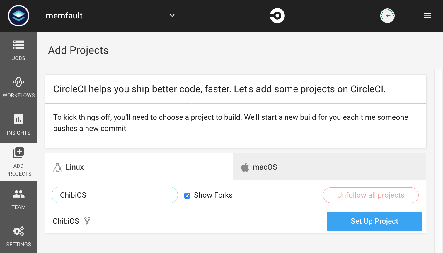 We’re now ready to set up CircleCI. Head to https://circleci.com, create an account, select “Add Projects” in the sidebar, and search for your ChibiOS repository.
